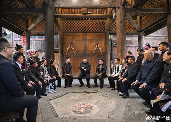 3月17日至18日,中共中央總書(shū)記、國(guó)家主席、中央軍委主席習(xí)近平在貴州考察。這是17日下午,習(xí)近平在黔東南州黎平縣肇興侗寨考察時(shí),在信團(tuán)鼓樓同村干部和村民代表圍坐在火塘邊,共話鄉(xiāng)村全面振興。新華社記者 謝環(huán)馳 攝
